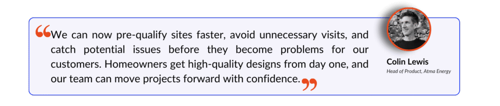 “The Scanifly team has been fantastic to work with and the integration we’ve built is seamless,” says Colin Lewis, Atma’s Head of Product. “We can now pre-qualify sites faster, avoid unnecessary visits, and catch potential issues before they become problems for our customers. Homeowners get high-quality designs from day one, and our team can move projects forward with confidence.”