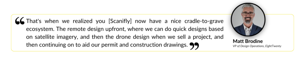 “That’s when we realized you now have a nice cradle-to-grave ecosystem,” Brodine explains. “The remote design upfront, where we can do quick designs based on satellite imagery, and then the drone design when we sell a project, and then continuing on to aid our permit and construction drawings.”